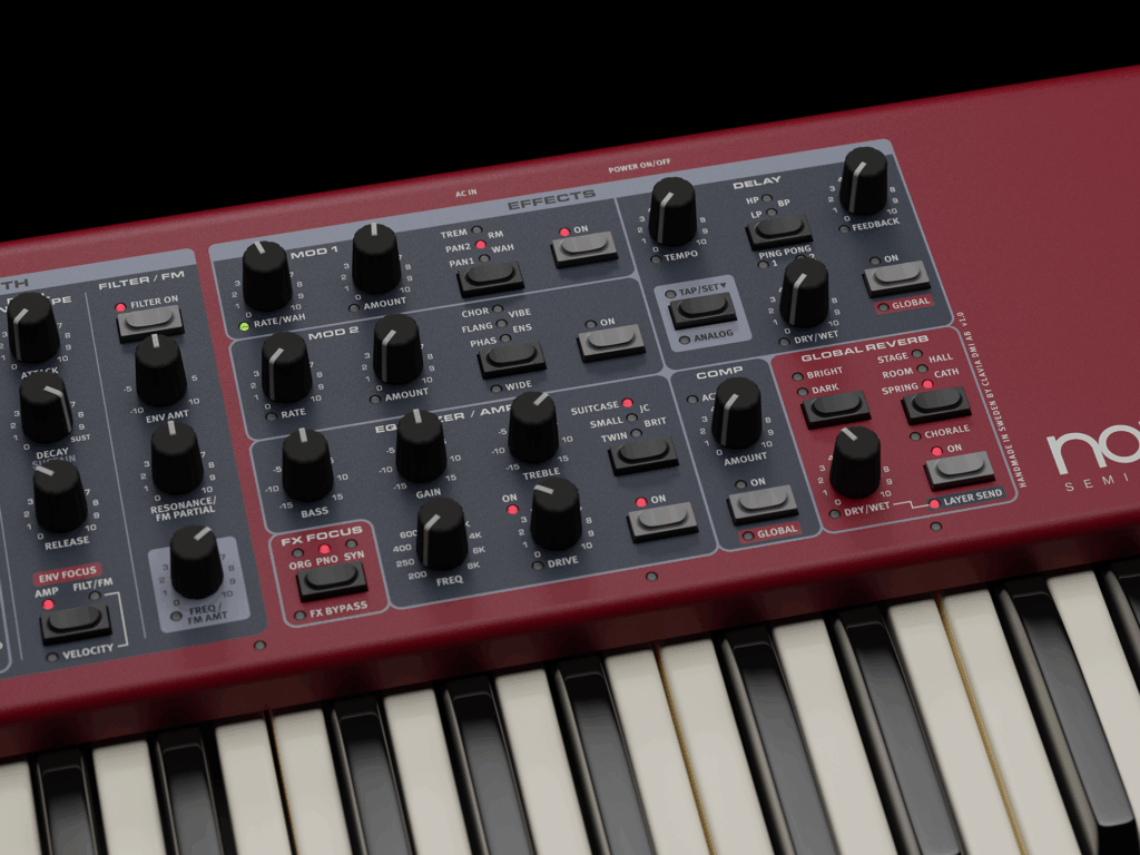 最新のピアノ機能に加え、高い評価を得ている Nord Organ 3 のオルガンおよびロータリースピーカーを搭載し、軽量かつステージ対応の筐体で卓越した汎用性を実現しています。